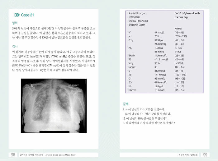 임상에서 편리하게 짧은 시간동안 체계적으로 정보를 이용할 수 있도록 근본 원리가 간단하게 정리되어 있는 책. 동맥혈 가스 분석은 단순히 수치만으로 결과를 해석하는 것이 아니라 환자의 임상 상태를 반드시 참조하여 판독하여야 한다고 알려져 있다. 이 책에는 25가지의 증례로 질문과 해답이 함께 포함되어 있어서, 전반부에 소개된 해석 원리에 따라서 실제 적용해 보도록 하고 있다.