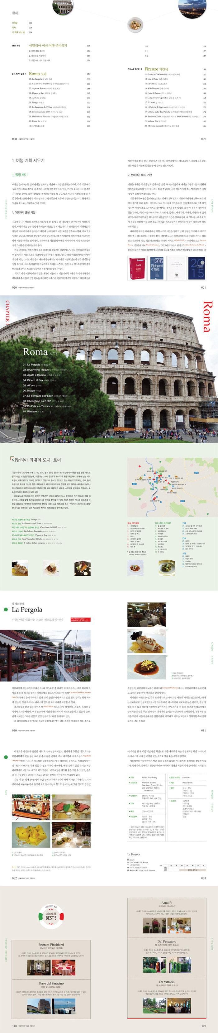 직접 다녀온 52군데 레스토랑에 대한 리뷰와 정보는 물론이고 앞으로 찾아가려고 주위의 지인들로부터 추천을 받은 레스토랑 54곳의 간략한 정보도 수록했다. 레스토랑만 담은 것은 아니다. 중간중간 찾아갈 만한, 샌드위치 같은 간식을 파는 곳 5곳과 젤라토 가게 16곳, 카페와 바 13곳의 리뷰도 들어있다. 아울러 재래시장이나 식자재 전문점, 와인숍, 주방용품이나 테이블 웨어를 파는 25군데의 쇼핑 스팟에 대한 정보도 수록했다.
