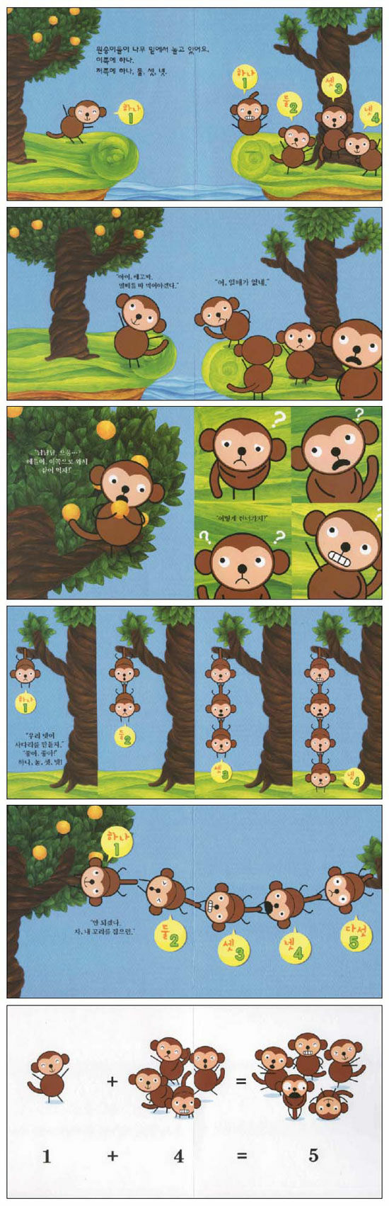 일본 'Milky cartoon'에서 제작하고, 일본 인기 어린이 채널 'KidsStation'에서 4년 연속 방영한 교육 애니메이션 '동글동글 동물친구' 시리즈를 책으로 만난다. 숫자 1 2 3 4 5 에 대한 개념을 덧셈 및 분할을 통해 인지할 수 있도록 구성하였다. 캐릭터 모양과 사물을 이용하여 기본적인 수 개념을 명확하게 전달한다.