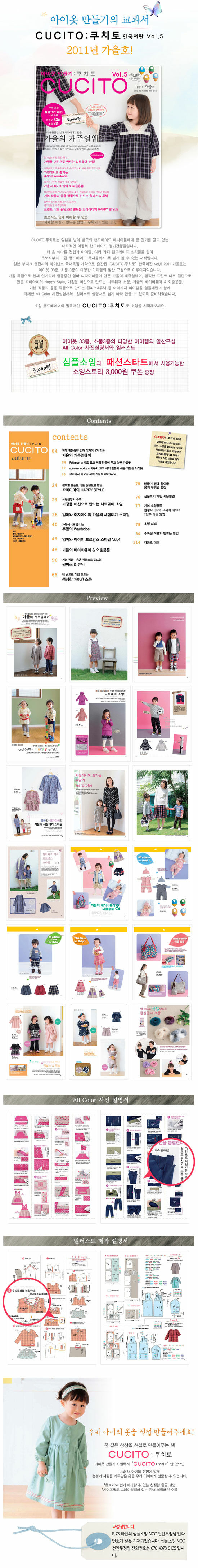 일본 고또모 출판사와 라이센스 국내독점 계약으로 출간된 ‘CUCITO:쿠치토’ 한국어판 vol.5권 2011 가을호. 아이옷 33종, 소품 3종의 다양한 아이템의 알찬 구성으로 이루어져있다. 매 호 색다른 컨셉과 아이템, 여러 가지 핸드메이드 소식들을 담아 초보자부터 고급 핸드메이드 독자들까지 폭 넓게 볼 수 있는 서적이다.