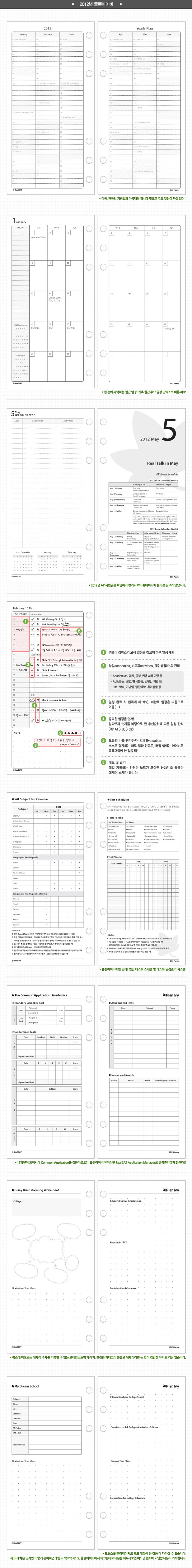미국대학 입시를 준비하는 고등학생을 위한 맞춤형 플래너. 특허 받은 체계적인 경력관리 시스템뿐만 아니라 매년 업데이트되는 최신 입시정보, 시험 스케줄, 가상 지원서, 지원대학 관리 도구까지, 플래너만 사용해도 저절로 모든 입시 준비가 이뤄진다. 학업, 비교과, 개인생활의 균형으로 효과적인 시간관리를 경험해볼 수 있을 것이다.