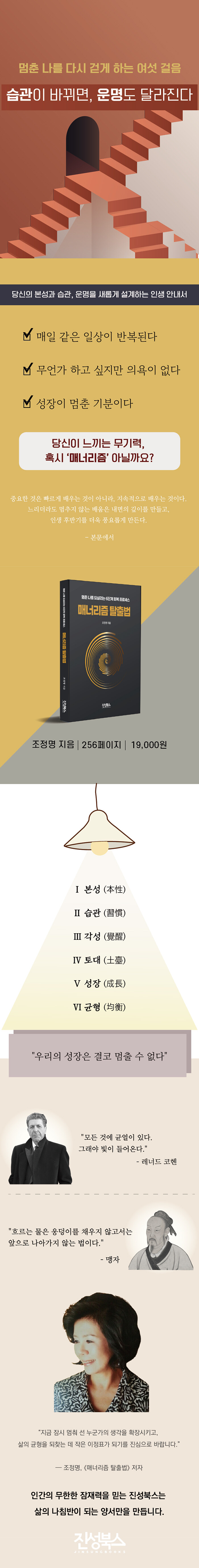 일, 관계, 성장, 자기계발의 어느 시점에서 누구나 마주하는 공통의 벽 ― 바로 매너리즘(mannerism)이다. 『매너리즘 탈출법』은 단순한 ‘자기계발의 구호’를 넘어, 저자가 수십 년간 연구하고 고민하며 깨닫게 된 ‘더 나은 성장을 위한 내면 회복의 실제 과정’을 6단계로 정리한 책이다.