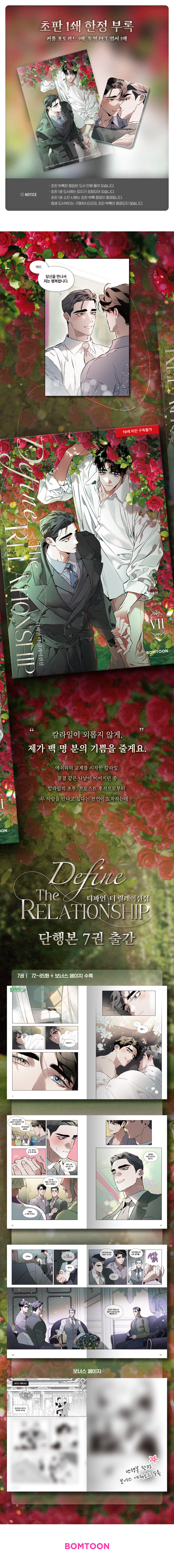 연인이라는 이름 아래 더욱 단단해져 가는 애쉬와 칼라일의 관계를 담은 〈디파인 더 릴레이션십〉 7권 출간! 7권에는 원작 외전 ‘One day’에 해당하는 에피소드 및 단행본 최초 공개 보너스 만화를 함께 수록했다.