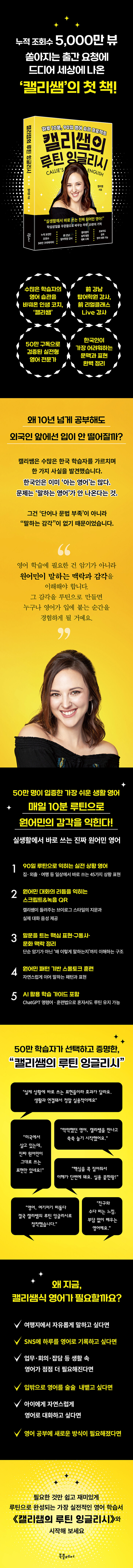 캘리쌤이 직접 녹음한 음원 QR을 통해 지문을 듣고 따라 말할 수 있으며, 원어민의 말하기 패턴을 기반으로 한 스몰토크 훈련과 AI를 활용한 학습 가이드까지 제공해 혼자서도 꾸준히 루틴을 유지할 수 있도록 구성했다. 영어는 단 하루 만에 갑자기 잘하게 되는 기술이 아니다. 하지만 하루에 10분이라도 꾸준히 입력하고, 말해보고, 글을 써보며 익숙해지는 과정이 쌓이면 어느 순간 영어가 머리가 아니라 입으로, 손으로 반응하기 시작한다. 이 책은 바로 그 과정을 현실로 만들어주는, 가장 실전적인 영어 루틴 가이드이다.