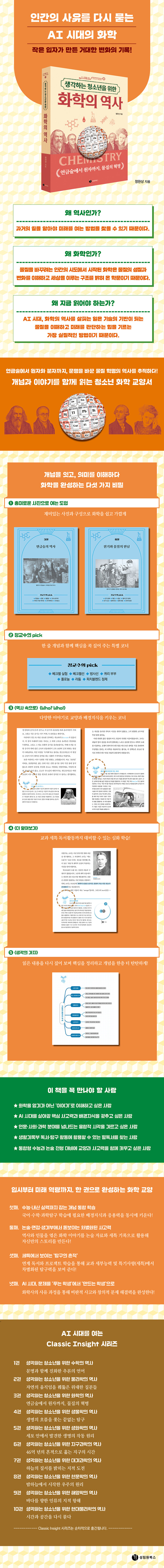 AI 시대를 여는 Classic Insight 시리즈의 세 번째 권 『생각하는 청소년을 위한 화학의 역사』는 변화하는 교육 환경과 평가 방식에 맞춰 기획됐다. 이 책은 고대 연금술에서 현대 화학에 이르기까지, 인류가 물질을 이해하고 다뤄 온 사고의 역사를 흥미로운 이야기로 풀어내며, 과학·기술·인문학을 아우르는 융합적 시야를 길러 준다. 단순한 반응식이나 공식 설명이 아니라, ‘왜 이 개념이 필요한가’라는 질문을 중심에 둔 구성은 새로운 평가 방식과 사고력 중심 학습에 정확히 부합한다.