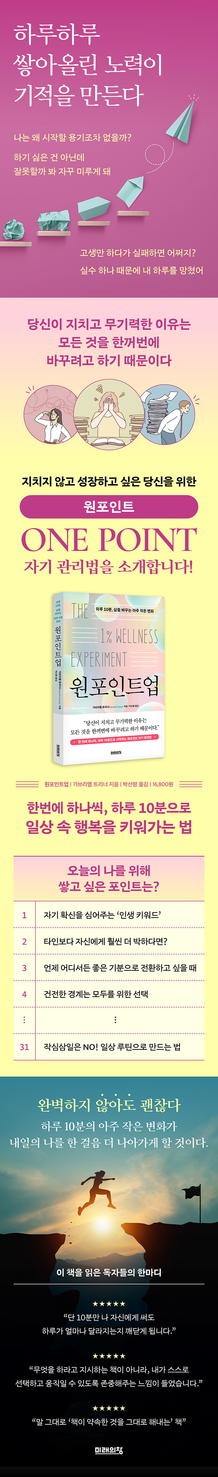 일상생활과 삶의 질에 영향을 미치는 여러 영역을 살피면서 경계 설정, 자신과 남과의 비교, 자기 관리, 사고방식, 수면, 습관, 자기 돌봄 등 다양한 주제를 다루는 동시에 독자들이 직접 실천해보도록 설계돼 있어서 하루 단 10분만 투자해도 삶에 변화를 경험할 수 있다.