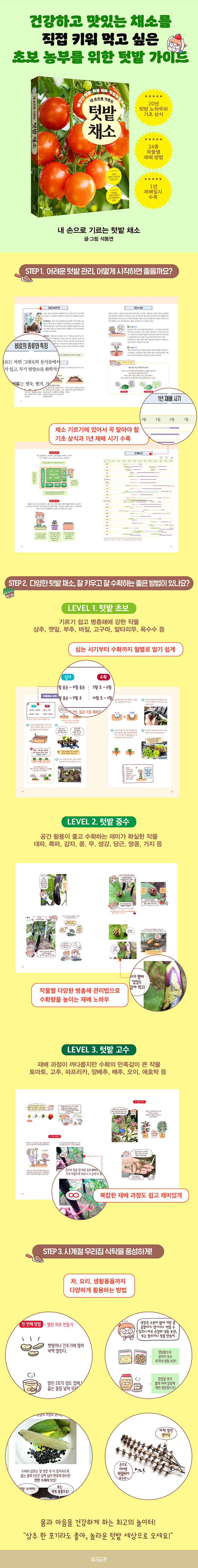 또한 24가지 작물 재배 과정과 관리 요령을 사진과 그림으로 쉽고 자세하게 알려준다. 씨앗 심는 간격과 포기 간격, 밑거름과 웃거름 주기, 솎아내기와 꽃대 제거, 수확 시기 맞추기, 연작 피해를 막는 이어짓기 등 초보자가 자주 실수하는 지점을 짚어준다. 복잡하게 느껴지는 텃밭 농사의 과정을 차근차근 따라가다 보면 실패는 줄이고 풍성한 수확을 얻을 수 있다.