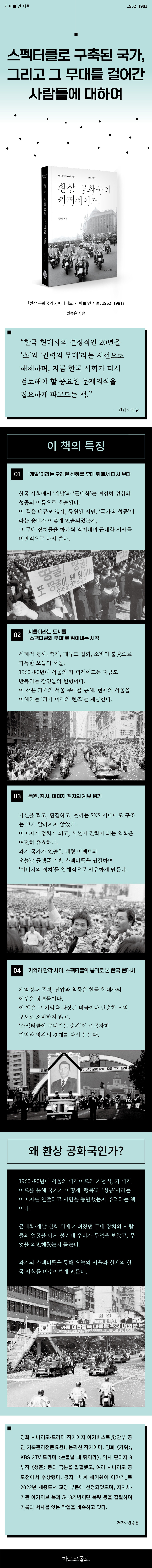 퍼레이드와 기념식의 무대 뒤에서 작동한 국가의 스펙터클을 추적한다. 근대화의 신화, 도시와 권력, 동원과 이미지의 정치를 1962년부터 1981년 서울의 장면으로 해체한다. 과거의 무대를 통해 현재를 비추며 우리가 무엇을 보았고 외면했는지를 묻는다.