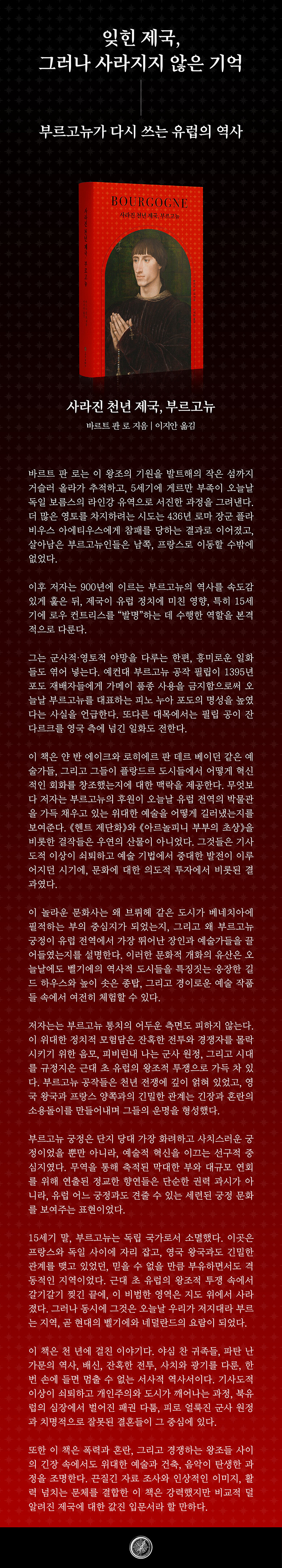 벨기에 출신의 역사 저술가 바르트 판 로는 이 책에서 부르고뉴를 단순한 중세의 공국이나 사라진 왕조가 아니라, 근대 유럽을 설계한 하나의 ‘문명 실험’으로 재정의한다. 406년 게르만족의 이동에서 시작해, 1496년 합스부르크 가문의 결혼으로 부르고뉴의 유산이 유럽 전역으로 확산되기까지, 이 책은 거의 천년에 걸친 시간을 하나의 거대한 서사로 엮어낸다.