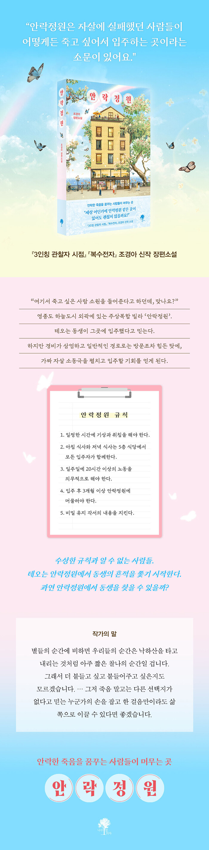 세계문학상 수상 작가 조경아의 신작 장편 『안락정원』은 자살을 시도했다가 실패한 사람들이 모여 사는 공간 ‘안락정원’의 이야기를 담은 작품이다. 소설 속 ‘안락정원’은 조경아의 전작에 등장하는 ‘복수전자’의 배경이자, 작가가 실제로 거주하는 영종도 신도시에 자리한다. 개발이 다 이루어지지 않은 공터와 건물들을 바라보며, 또 우리 주변을 떠도는 수많은 죽음의 사연과 소문들을 접하며 작가는 ‘죽고 싶은 사람들이 모여 사는 안락정원’이란 미지의 구조물을 만들어냈다. 흥미진진한 미스터리가 될지, 슬프고 우울한 드라마가 될지, 혹은 어떤 다른 가능성을 추구할지 알 수 없는 그 안락정원의 실체를 파헤치기 위해 잠입하는 주인공의 이름은 ‘테오’. 전작 『3인칭 관찰자 시점』에서 연쇄살인범의 아들로 폭력 옆에서 살아남고, 『복수전자』에서 부조리함을 돌파하는 복수의 연대를 끌어가고, 『집 보는 남자』에서 집 보는 능력으로 동네 연쇄살인을 추적한 그 동명의 인물 ‘테오’가 이 작품 『안락정원』에선 ‘자살 미수자’들이 ‘서로 돕는’ 공간을 탐색하는 주인공이 된다. 누구보다 죽음에 가까이 다가가는 이 긴 여정은 테오를 삶에 대해, 그리고 자기 자신에 대해 예기치 못한 통찰에 이르게 하며, 우리에게 삶과 죽음을, 자신과 이웃을 새로운 눈빛으로 바라보게 한다.