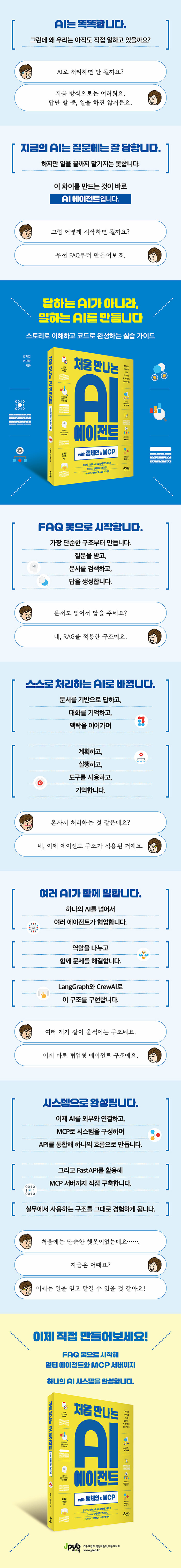 이 책을 끝까지 따라가면, 챗봇 수준에서 멈추지 않습니다. 실제로 일을 처리하는 AI 시스템을 직접 만듭니다. 이제는 AI에게 무엇을 물어볼지 고민하는 데서 벗어나 어떤 일을 맡기고 어떻게 흐름을 설계할지 스스로 결정할 수 있게 될 것입니다.