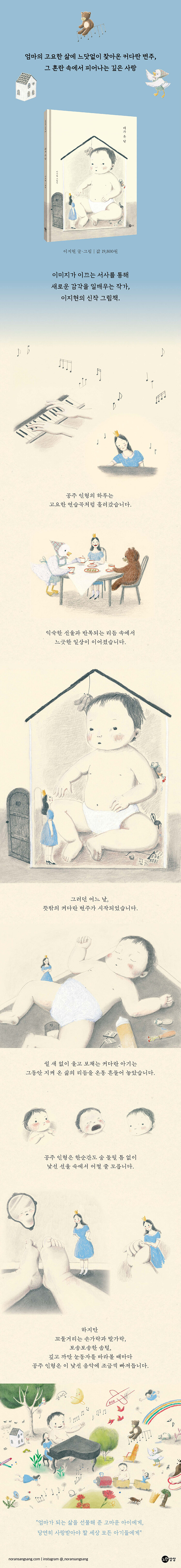 자그마한 인형의 집에서 소박한 피아노곡을 연습하고, 이웃과 차를 마시며 평온한 나날을 보내던 공주 인형에게 어느 날 커다란 아기가 찾아옵니다. 아기와 함께하는 시간은 마치 건반을 세차게 두드리는 변주곡처럼, 잠시도 숨 돌릴 틈 없이 요란하고 벅찹니다. 하지만 공주는 어느새 그 사랑스럽고도 낯선 존재에게 마음을 빼앗기고 마는데…. 세상 모든 엄마의 애틋한 마음을 따스하게 보듬어 주는 그림책!