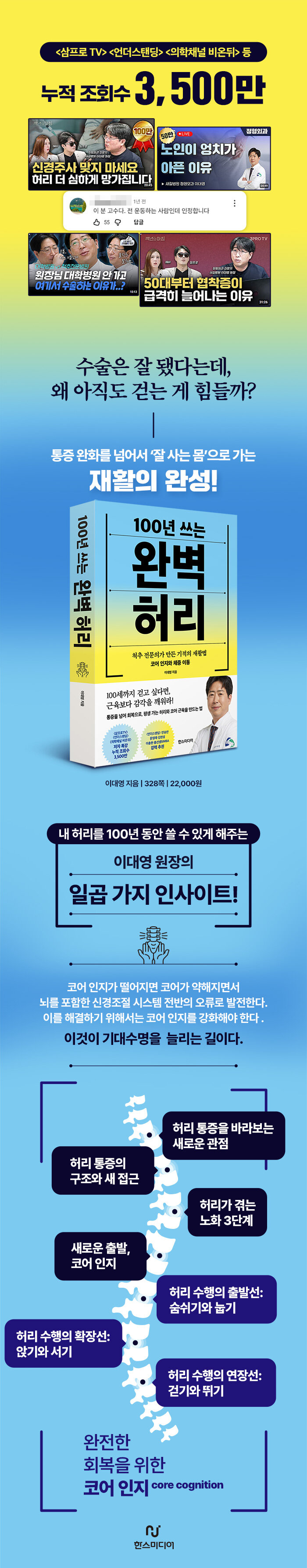허리 통증은 현대인의 숙명과도 같다. 전 세계 성인의 80%가 평생 한 번 이상은 경험하며, 국내에서도 국민 네 명 중 한 사람은 척추 질환으로 고통받고 있다. 우리는 통증이 생기면 당장 진통제를 찾거나 수술대에 오르지만, 정작 ‘통증이 사라지는 것’과 ‘몸이 회복되는 것’이 전혀 별개의 문제라는 것을 아는 사람은 많지 않다. 이 책 『100년 쓰는 완벽 허리』의 저자 이대영 원장은 세계 최초로 뼈를 깎지 않고 신경 압박을 해소하는 ‘골절제 없는 감압술(NOLD)’을 성공시킨 척추 수술 전문가다. 수술이 완벽했음에도 제대로 걷지 못하는 환자들을 보며 현대 의학의 한계를 체감한 그는 그에 대한 답을 찾기 위해 정형외과학을 넘어 뇌신경과학과 재활의학을 다시 공부했고, 회복의 핵심이 근육 강화가 아닌 ‘코어 인지(Core Cognition)’에 있음을 알게 되었다. 단순히 아픈 부위를 고치는 의학에서 벗어나, 숨쉬기와 눕기부터 앉기, 서기, 그리고 최종 단계인 ‘토르소 걷기’와 ‘슬로우 러닝’까지 일상의 모든 움직임을 척추 안정화 과정으로 바꾸는 구체적인 방법론을 제시하는 이 책은 수술 후 재활이 필요한 환자부터 만성 통증에 시달리는 직장인까지, 100년 동안 나를 지탱해 줄 완벽한 허리를 만드는 가장 과학적인 길잡이가 되어줄 것이다.