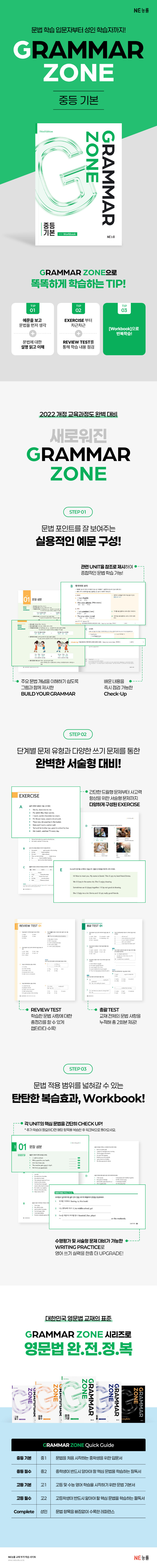 왜 예문이 문법 설명보다 먼저 제시되어 있을까요? 맥락이 있는 예문을 통해 학습자는 문법 규칙을 스스로 찾아낼 수 있어 이해도 잘 되고 기억에도 오래 남습니다. 문법 설명이 먼저 제시되어 있으면, 학습자는 수동적으로 문법 규칙을 암기하려고 합니다. 즉, 예문을 보고 어떤 규칙이 있는지 생각해 본 후, 옆의 설명을 읽으면 『Grammar Zone』의 학습 효과를 극대화할 수 있습니다. 복습할 때는 설명을 먼저 읽어도 좋고, 설명만 한 번 더 읽으며 개념을 정리할 수도 있습니다.