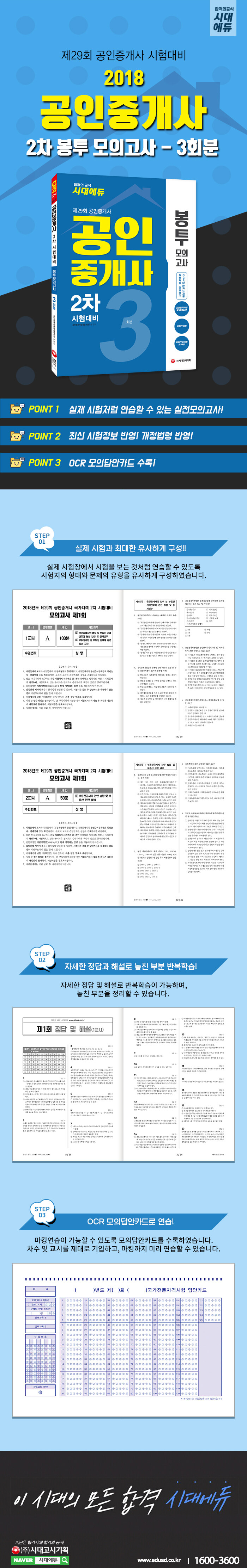 · 제목 : 2018 공인중개사 2차 봉투모의고사 3회분 (제29회 공인중개사 2차 시험대비/ OCR답안카드제공/ 실전처럼연습하기)