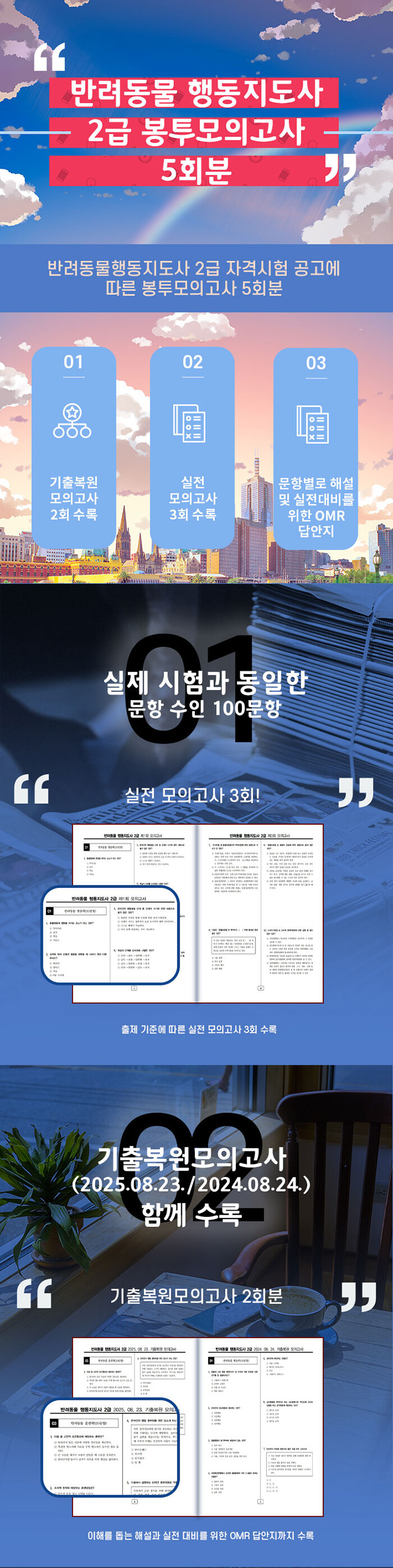 반려동물행동지도사 2급 1차 필기시험 대비를 위한 봉투모의고사 5회분으로, 실제 시험과 동일한 문항 수인 100문항으로 구성하였으며, 이해를 돕는 해설과 실전 대비를 위한 OMR 답안지까지 수록하였다.