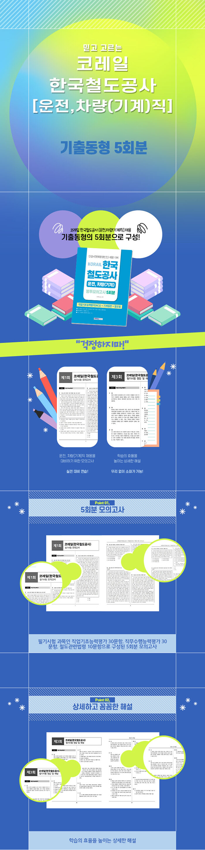 코레일 한국철도공사 운전·차량(기계)직 채용 대비를 위한 기출동형 모의고사 5회분이다. 직업기초능력평가, 직무수행능력평가, 철도관련법령을 실전 구성으로 수록하고 상세한 해설과 OMR 답안지로 실전 연습이 가능하다.