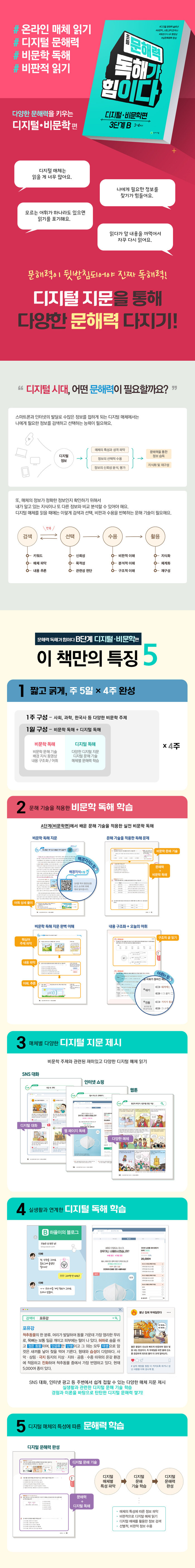A단계에서 익힌 문해 기술을 다양한 비문학 지문에 실전 적용하여 독해 실력을 다지고 쌓을 수 있다. 스마트폰과 컴퓨터를 활용한 다양한 디지털 매체(SNS, 웹 페이지, 웹툰, 동영상 등) 특성을 파악하고 디지털 독해에 효과적인 문해력을 쌓을 수 있다.