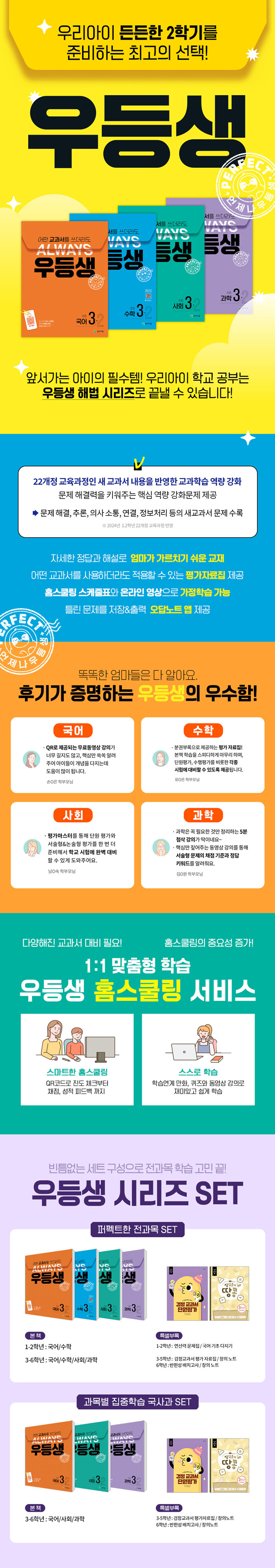우등생 국어, 우등생 수학, 우등생 사회, 우등생 과학으로 구성된 세트이다. 세트 부록으로 <반편성 배치고사>와 <교과 퍼즐 창의가 말랑 젤리>를 제공한다. 첨삭 영상, 자세한 정답과 풀이를 구성하였고, 사회, 과학 검정교과서 완벽를 완벽 반영하였다.