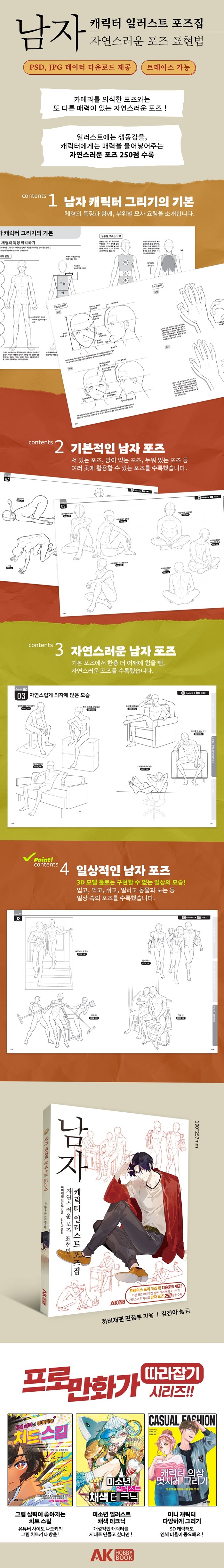 남자 캐릭터의 기본적인 선 자세나 앉은 자세는 물론이고, 학교생활이나 회사 업무, 취미 활동, 식사 등 자연스러운 일상 포즈를 수록하였다. 남자 캐릭터들의 개성을 살리는 다채로운 포즈를 이용하여 매력적인 작품을 완성해보자.
