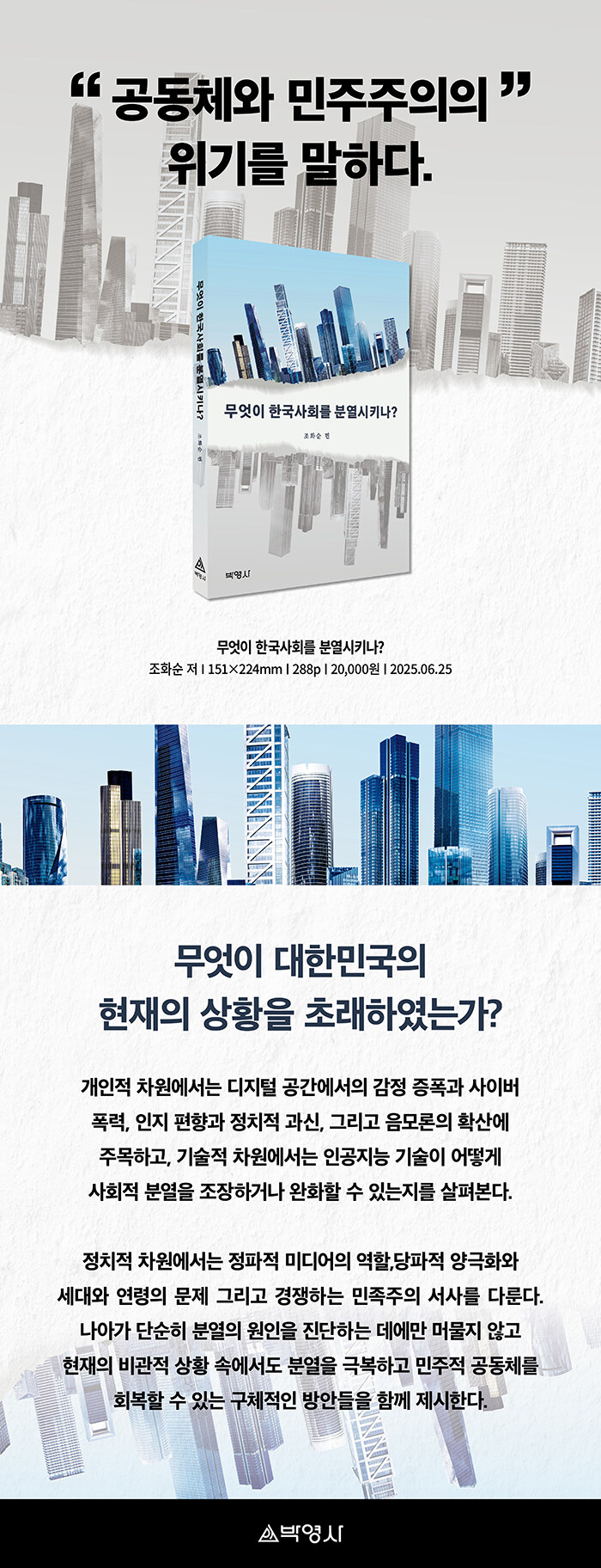 『무엇이 한국사회를 분열시키나?』는 최근의 급변하는 정세가 반영되어 있다. 탈진실 시대를 살아가는 사람들이 각자의 진실을 주장하며 정치적 양극화로 나아간다는 점은 이미 많은 이들이 인지하는 현상이다. 그러던 중 2024년 12월 계엄령 선포와 뒤이은 탄핵 과정을 거치며 전개된 일련의 사태는 일반 국민들의 예상을 훨씬 뛰어넘는 충격을 안겼다. 한국사회 내 분열의 양상이 우리가 인식했던 수준보다 훨씬 더 심각하다는 사실이 드러났고, 이로 인해 ‘무엇이 현재의 상황을 초래했는가’라는 근본적인 질문이 제기되기에 이르렀다. 이러한 질문에 균형잡힌 관점에서 체계적으로 정리된 답변을 접하기는 쉽지 않아 보인다. 언론과 정치권에서 제시되는 설명들은 부분적인 요인들을 다루고 있어 전체적인 그림을 파악하기 어렵고, 시민들이 더 쉽게 접하는 유튜브 등의 뉴미디어에서는 특정 관점에 치우친 설명들이 주를 이룬 한편 학계의 연구 성과들은 전문적이어서 대중들이 쉽게 접근하기 어렵다.