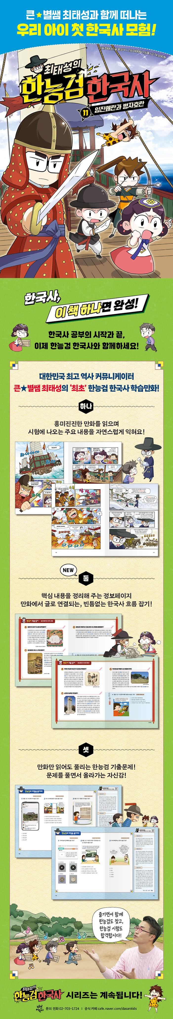 평생 역사 습관, 《최태성의 한능검 한국사》로 시작하자. 큰별쌤 최태성이 직접 기획한 첫 한국사 학습만화다. 11권에서는 임진왜란과 병자호란을 생생하게 만나고, 정보페이지와 한능검 기출문제로 한국사의 흐름과 자신감까지 함께 잡는다.