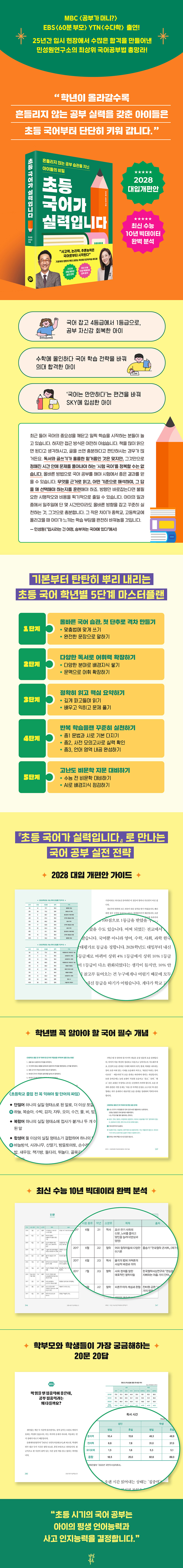 이러한 국어 공부의 핵심 노하우를 담은 『초등 국어가 실력입니다』에는 ‘올바르게 읽고 쓰고 말하기’, ‘배경지식 쌓기’, ‘정확하게 읽고 요약하기’, ‘어휘 늘리기’, ‘시험으로 내 실력을 점검하기’ 등 단계별 학습 전략과 실천 방법이 오롯이 담겨 있다. 초등 저학년에서부터 중학교 졸업 전까지, 시기별로 적용 가능한 학습법을 세세하게 소개하며, 학부모와 학생들이 가장 궁금해하는 20문 20답을 수록해 1:1 코칭도 빼놓지 않았다. 또한 2028년 대입 개편에 따른 등급제 변화와 최신 기출문제 분석, 10년간의 수능 빅데이터와 미리 읽어두면 좋은 교양도서 및 문제집 추천까지, 어느 것 하나 소홀함이 없다.