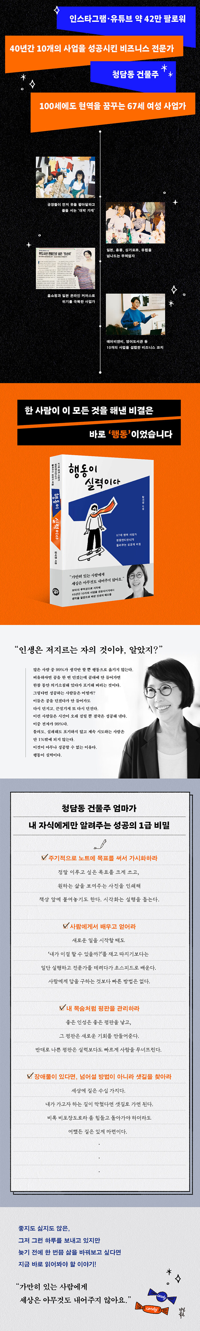 이 책은 청담캔디언니가 지금까지 한 번도 말한 적 없던 내밀한 고민과 그 고민을 해결해 나간 과정, 지금의 위치에 오르기까지 어떤 지난한 시간을 보냈는지를 고스란히 담고 있다. 『행동이 실력이다』라는 제목은 ‘돌이켜 보니 그 어떤 위기든 역경이든 넘어설 수 있었던 비결은 결국 행동이었다’는 저자의 결론을 담아냈다. 아들에게 들려주고 싶어 노션 한가득 채워놓았던 청담동 부자 엄마의 행동, 위기, 습관, 사업, 관계에 대한 조언들이 이 책에 펼쳐진다.