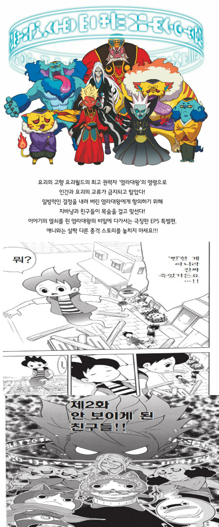 '일상생활에서 일어나는 여러 곤란한 일들은 모두 요괴의 짓'이라는 재미있는 발상으로 감동부터 개그까지 안겨준 '요괴워치'가 올 여름에도 극장판 애니메이션으로 다시 찾아온다. 7월 21일 개봉하는 <극장판 요괴워치:염라대왕과 5개의 이야기다냥!>을 완전 독점 만화화한 흑백 만화를 서점에서 만나보자.