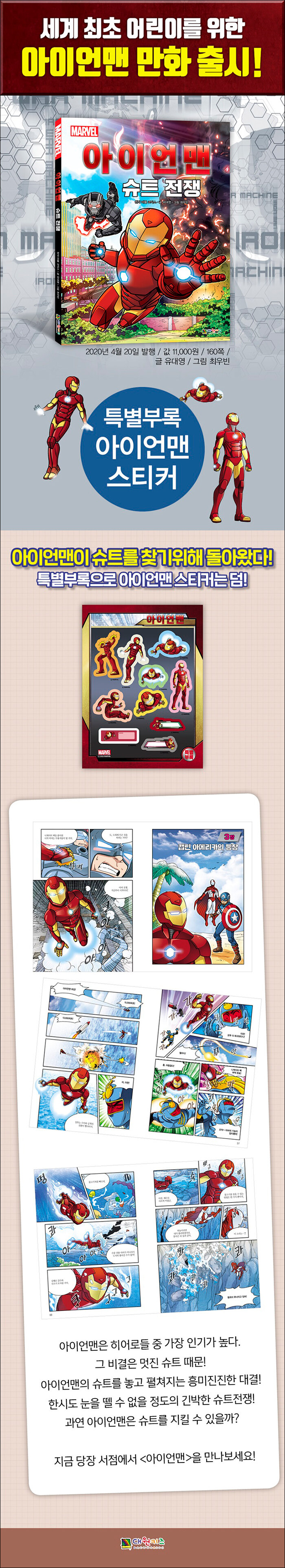 마블코믹스 원작을 바탕으로 국내 작가가 어린이만화로 새롭게 그린 신작. 악당들이 아이언맨의 기술을 훔쳐 아이언맨 능력을 지닌 슈트를 개발하게 된다. 슈트는 아이언맨을 공격하는 무기가 되고, 이에 아이언맨은 슈트 제작의 기술을 훔친 악당을 쫒는다.