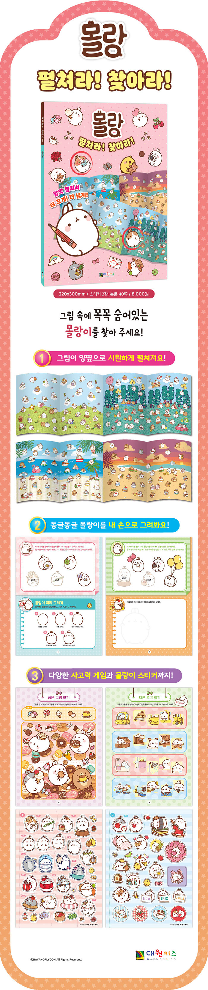 책을 활짝 펼쳐서 와글와글 모여있는 몰랑이를 찾아 주세요. 커다란 그림 속에 몰랑이들이 꼭꼭 숨어있어요. 다양한 배경 속 숨어있는 몰랑이들을 찾아보고 사고력을 자극하는 다양한 게임까지 즐겨 보세요.
