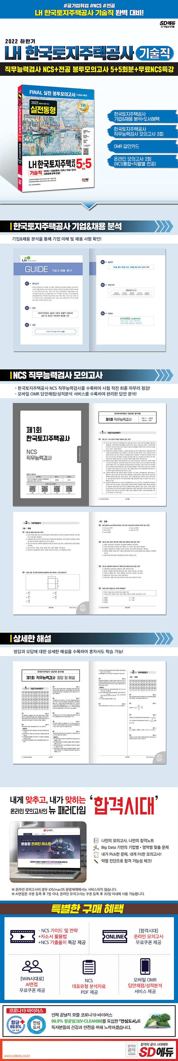 · 제목 : 2022 하반기 LH 한국토지주택공사 직무능력검사 기술직 NCS + 전공 봉투모의고사 5+5회분 + 무료NCS특강 (2022년 하반기 채용 대비/한국토지주택공사 기술직 모의고사/기출특강/온라인 모의고사/AI면접 무료제공/모바일 OMR 답안분석 서비스)