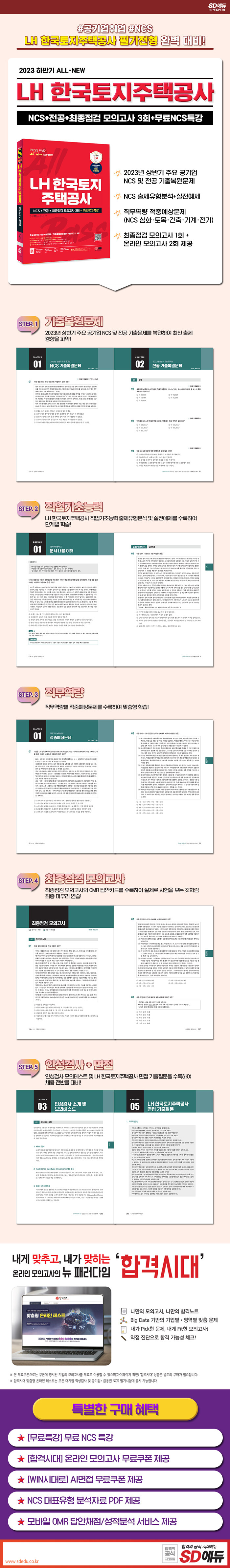 · 제목 : 2023 하반기 All-New LH 한국토지주택공사 직무능력검사 NCS + 전공 + 최종점검 모의고사 3회 + 무료NCS특강 (주요 공기업 NCS 및 전공 기출복원문제/직업기초능력평가 및 직무역량평가 기출예상문제/실전모의고사/기출특강/온라인 모의고사/AI면접 무료제공/모바일 OMR 답안분석 서비스)