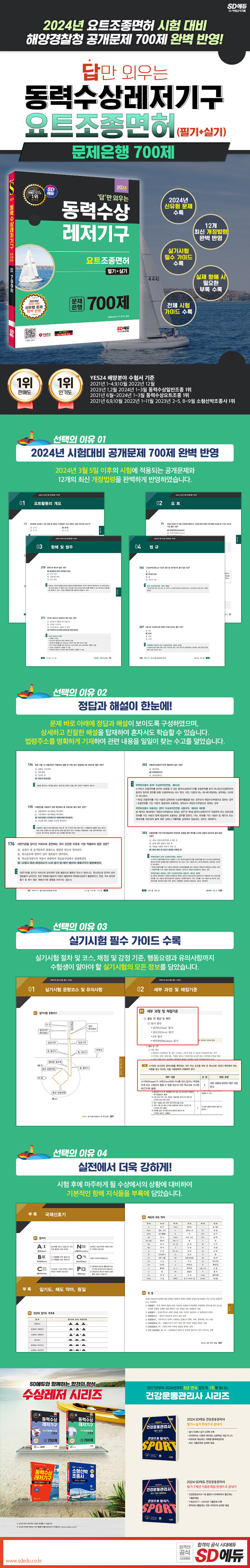 · 제목 : 2024 시대에듀 답만 외우는 동력수상레저기구 요트조종면허시험(필기+실기) 문제은행 700제 (2024년 요트조종면허 시험 대비 해양경찰청 공개문제 700제 완벽 반영)