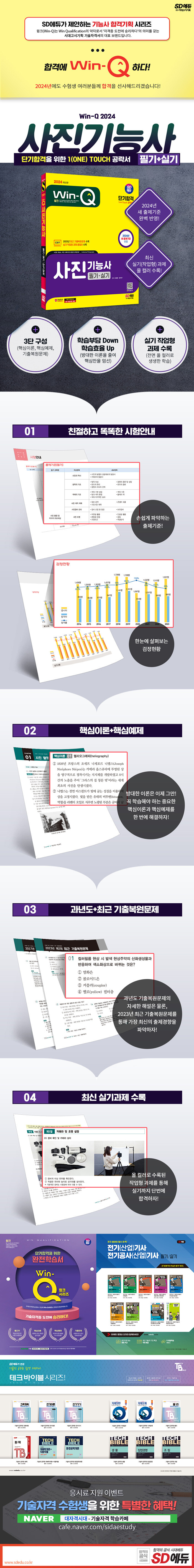 · 제목 : 2024 시대에듀 Win-Q 사진기능사 필기+실기 단기합격 (2024년 새 출제기준 반영! 최근 기출복원문제 수록! 실기(작업형) 올컬러 수록!)