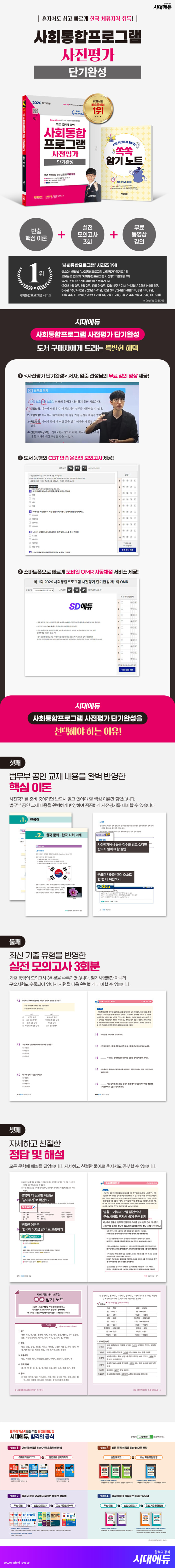 · 제목 : 2026 시대에듀 사회통합프로그램 사전평가 단기완성 + 무료 강의 (올컬러 / 핵심 이론 / 실전 모의고사 3회 / 소책자 쏙쏙 암기 노트)