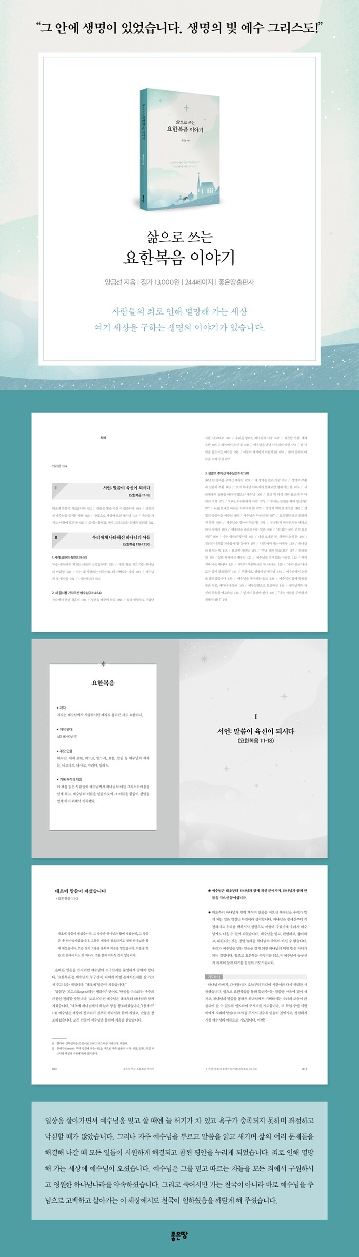 가나에서 열린 결혼식 / 성전을 깨끗이 하심 / 물과 성령으로 거듭난 사람, 니고데모 / 우리를 향하신 하나님의 사랑 / 겸손한 사람, 세례 요한 / 하늘에서 오신 분 / 예수님을 만난 사마리아 여인 / 한 사람을 찾으시는 예수님 / 이분이 메시아가 아닐까요? / 왕의 신하의 아들을 고쳐 주심
