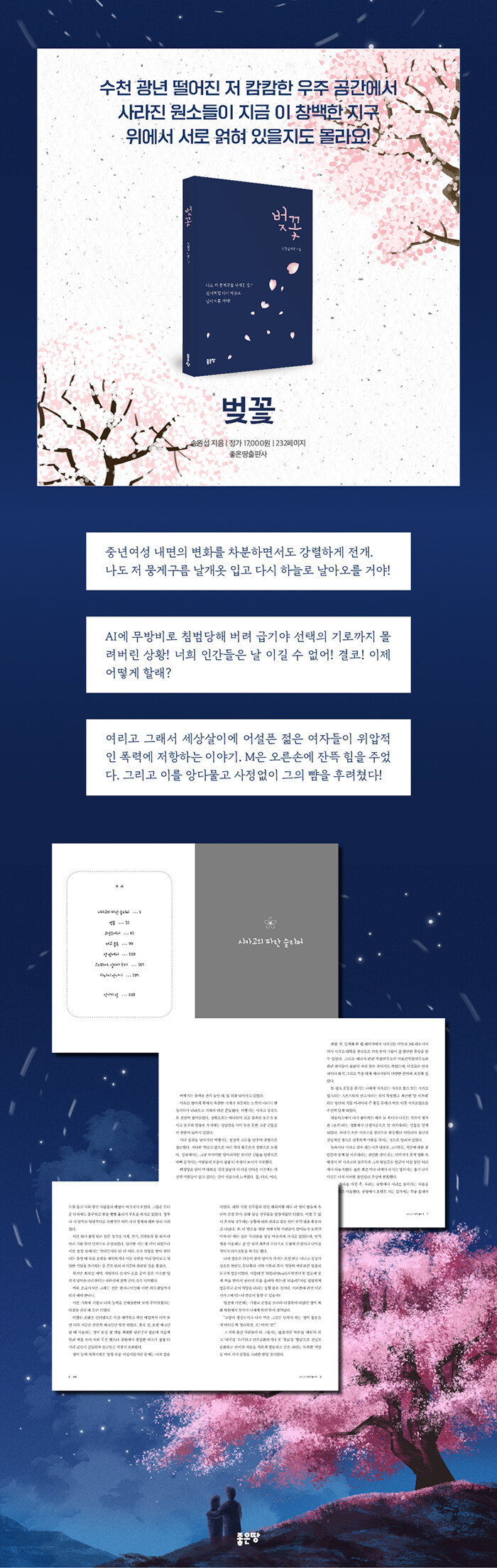 소설집 《벚꽃》 속의 작품들은 이 시대 우리의 일상속에 파뭍혀 있는 내밀한 순간들을 포착하여, 독자로 하여금 자신의 경험 및 감정들과 조우하게 한다. 표제작 <벚꽃>을 비롯해 <시카고의 파란 슬리퍼>, <코엑스에서>, <레고 블록>, <성 밖에서>, <그리하여, 킬러가 되다>, <타라미 만나기>까지 총 일곱 편의 단편이 수록되어 있다.