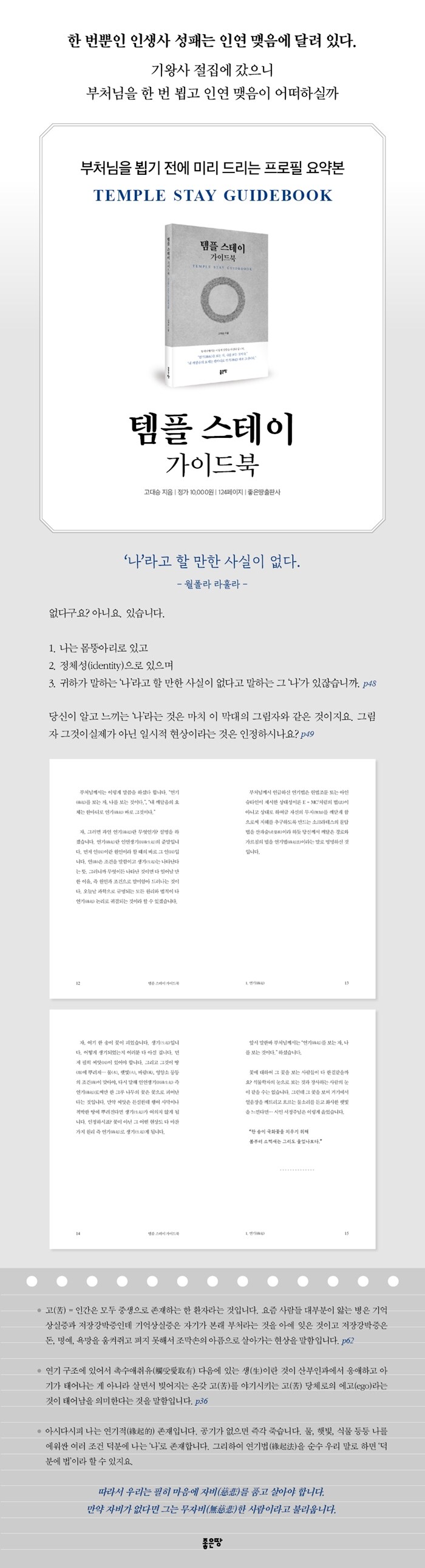 템플스테이 참여자들이 불교의 기본 개념을 쉽고 진솔하게 이해할 수 있도록 돕는 안내서다. 연기(緣起), 무아(無我), 사성제(四聖諦), 팔정도(八正道), 오계(五戒), 육바라밀(六波羅密), 윤회(輪迴), 중도(中道) 등 불교 핵심 개념들을 현장의 언어로, 일상의 예시와 함께 풀어낸다.