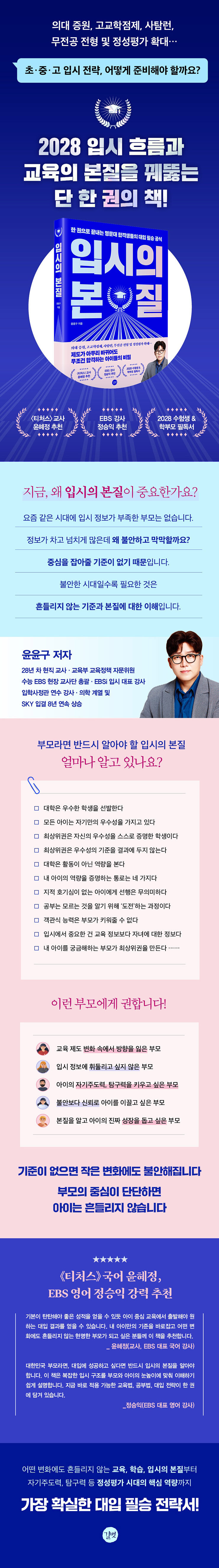 저자는 교육부 정책자문위원, EBS 대표 입시 강사로 활동하며 전국 입학사정관들을 교육하고 2025학년도 의학 계열 및 SKY 입결 8년 연속 상승이라는 성과를 만들어낸 입시 전문가이다. 이 책은 그의 오랜 현장 경험과 통찰을 바탕으로, 학생들이 단기적 성적 향상에 머무르지 않고 ‘공부의 본질’을 이해함으로써 진정한 성장과 성공을 이룰 수 있도록 돕는다. 책의 1부에서는 어떤 제도 변화에도 흔들리지 않는 교육·학습·입시의 본질을 다룬다. 이를 통해 내 아이의 학습 태도, 사고력, 자기주도성 등 ‘입시의 기초 체력’을 점검하고 아이 맞춤 대입 전략을 설계하는 데 필요한 힌트를 얻을 수 있다. 2부에서는 앞으로의 대입 방향성을 전망하며 정성평가 시대에 필요한 학생의 역량과 부모의 역할을 담았다. 부록의 2028학년도 대입 제도 개편안, 고교학점제, 논·서술형 평가 대비 전략까지, 이 책은 막막한 입시 터널 앞에서 갈피를 잡지 못하는 부모들에게 선명한 길잡이가 되어줄 것이다.