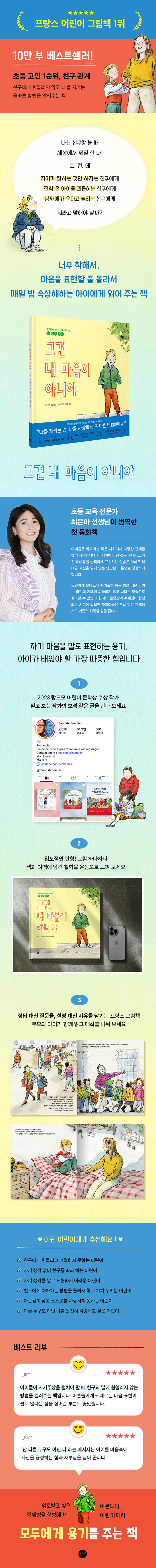 《왜 사람이 아름다울까요》로 2023 랑드모 어린이 문학상을 수상한 작가는 《그건 내 마음이 아니야》를 통해 있는 그대로의 나를 지키고 사랑하는 방법을 일깨워 줍니다. 아이가 관계의 첫발을 건강하게 내딛길 바라는 부모라면 자기 마음을 표현하는 올바른 방법을 가르쳐 주세요.