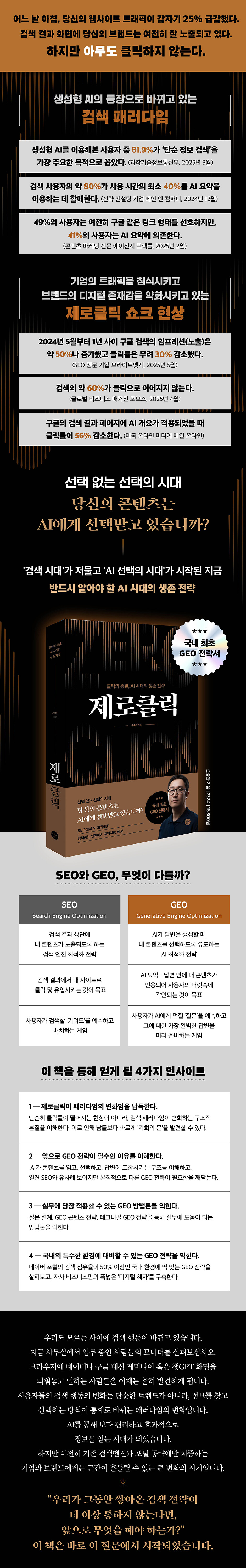 아무쪼록 이 책이 독자 여러분의 제로클릭과 AI 검색 최적화에 대한 갈증을 조금이나마 해소하고, 현업에서 매일 치열하게 일하고 계신 분들에게 실제로 도움이 되기를 바랍니다.