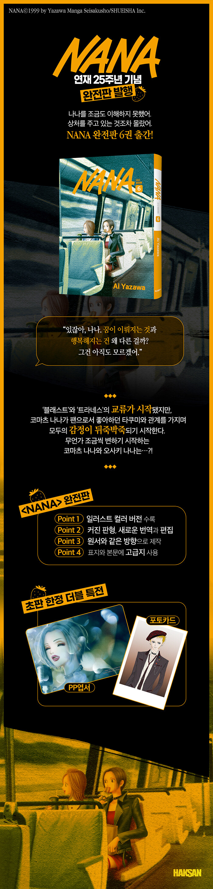 첫 연재 이후로 지금까지 꾸준히 사랑받는 레전드 순정만화! 작화, 연출 모두 지금 보아도 트렌디한 올라운더! 그 시절 소녀들에게 꿈과 희망, 사랑과 절망을 알려준 바로 그 작품, <NANA>가 연재 25주년을 기념하여 완전판으로 출간됩니다. 기존 단행본에 흑백으로 실린 컬러 일러스트를 온전히 수록하였으며, 새로운 번역 및 편집은 물론 훨씬 커진 판형으로 가독성까지 고려하여 최고의 퀄리티로 선보입니다.