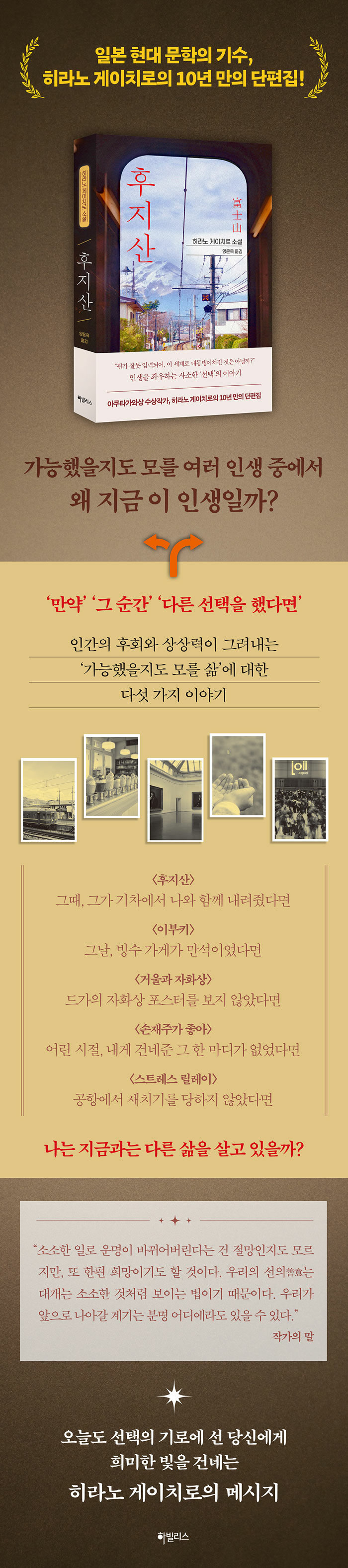 순간의 선택이 운명을 어떻게 바꿀지는 아무도 모른다. 그저 그 순간이 지난 후에야 '그때 ~했더라면'이라는 가정으로 지나간 선택에 대해 곱씹을 뿐이다. 삶 속의 예기치 않은 갈등과 상실의 의미를 탐색해온 히라노 게이치로가 이번 작품에서는 ‘순간의 선택’이라는 가장 일상적이면서도 결정적인 질문을 꺼내 들었다.