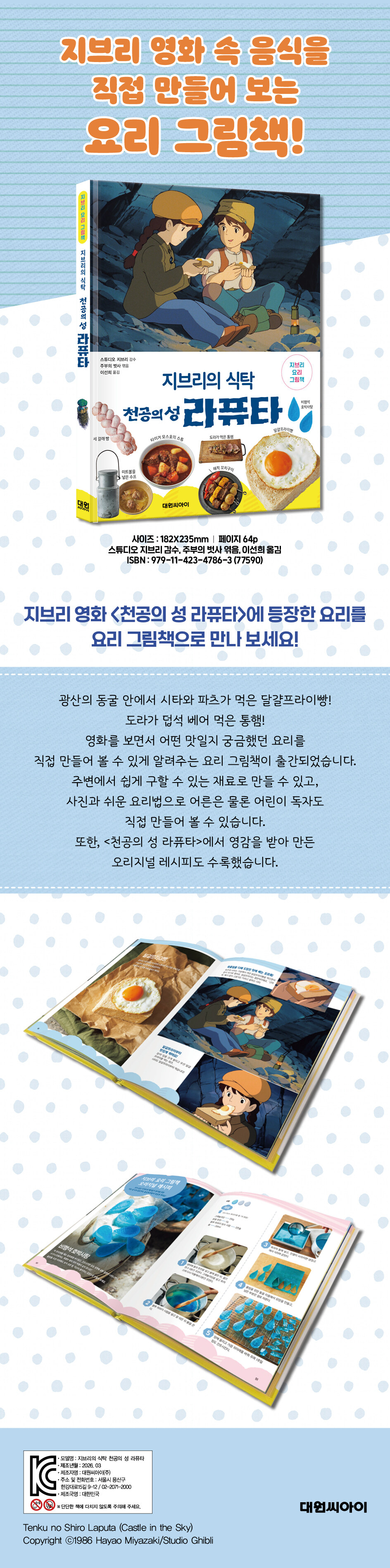 이 책에서는 <천공의 성 라퓨타>에 등장하는 요리를 집에서도 만들어 볼 수 있도록 레시피로 소개합니다. 영화 속 장면을 떠올리며 직접 요리를 만들어 보면, 마치 이야기 속 세계에 조금 더 가까이 다가간 듯한 즐거움을 느낄 수 있습니다.