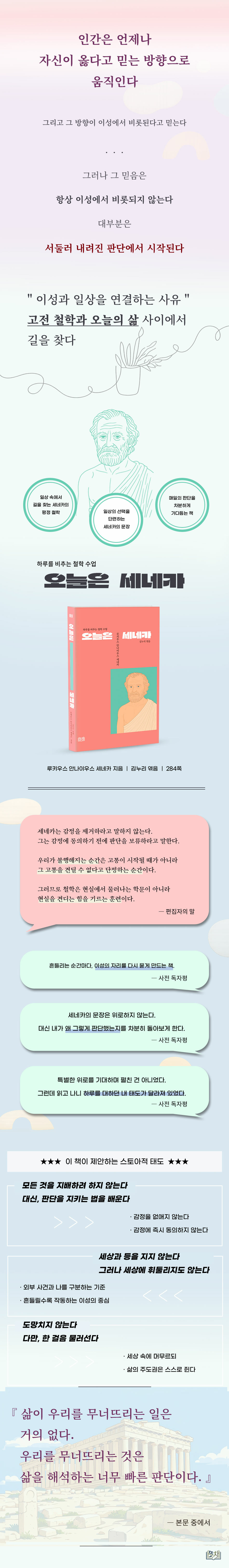 이번 책은 세네카의 저작과 서간에서 오늘을 사는 우리에게 필요한 지혜를 골라 담았다. 시간, 감정, 관계, 행동에 관한 그의 통찰을 현대의 언어로 풀어내어, 바쁜 일상 속에서도 곱씹어볼 수 있도록 구성했다. 세네카의 한 문장이 삶을 바꾸는 사유의 시작이 되기를 바란다.
