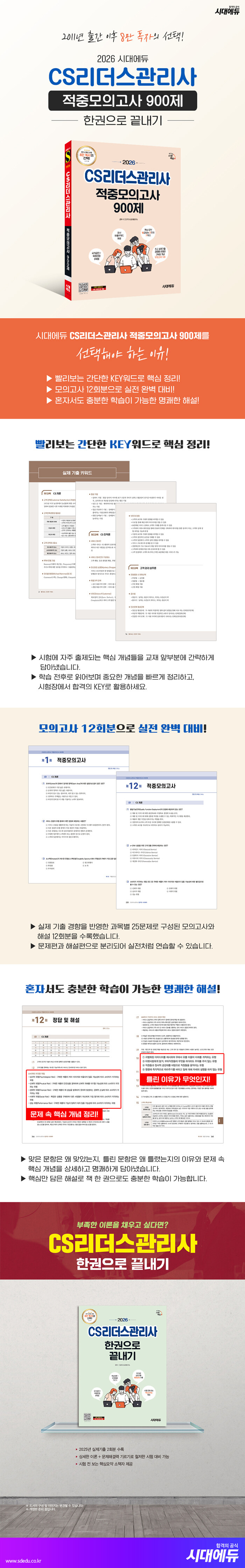 · 제목 : 2026 시대에듀 CS리더스관리사 적중모의고사 900제 한권으로 끝내기 (2016~2025년 실제기출 경향을 반영한 고득점 겨냥 모의고사 12회분)