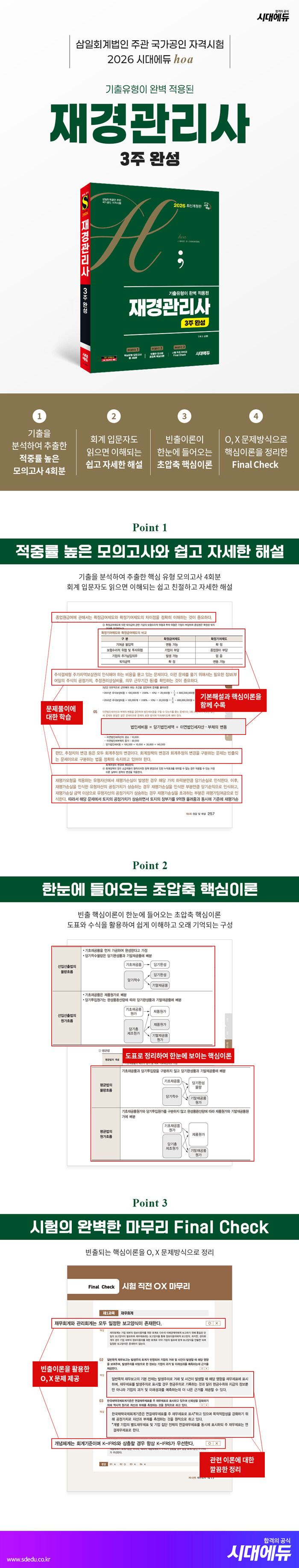 · 제목 : 2026 시대에듀 hoa 기출유형이 완벽 적용된 재경관리사 3주 완성 (핵심유형 모의고사 총 4회분 / 빈출만 엄선한 초압축 핵심이론 / 시험 직전 마무리 Final Check)