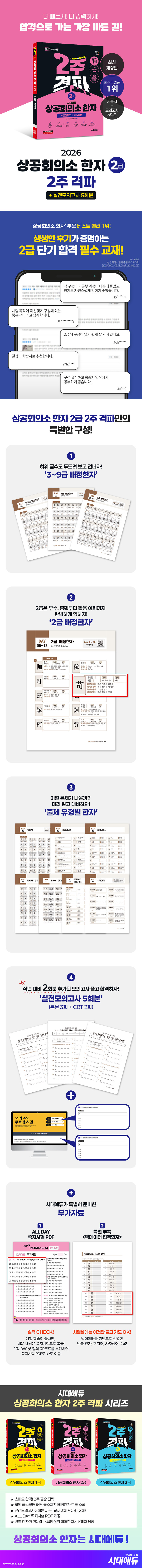 · 제목 : 2026 시대에듀 상공회의소 한자 2급 2주 격파 + 실전모의고사 5회분 (쪽지시험 PDF+소책자+CBT 2회분 제공)