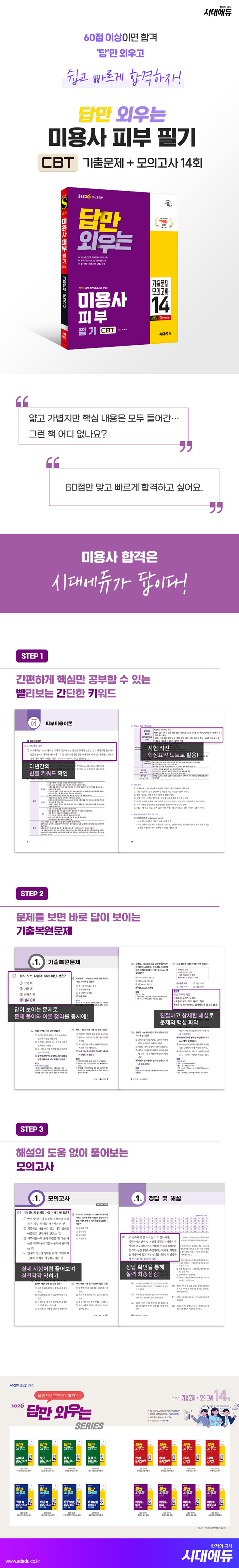 · 제목 : 2026 시대에듀 답만 외우는 미용사 피부 필기 CBT기출문제+모의고사 14회 (정답이 한눈에 보이는 기출복원문제 7회+실제 시험처럼 풀어보는 모의고사 7회)